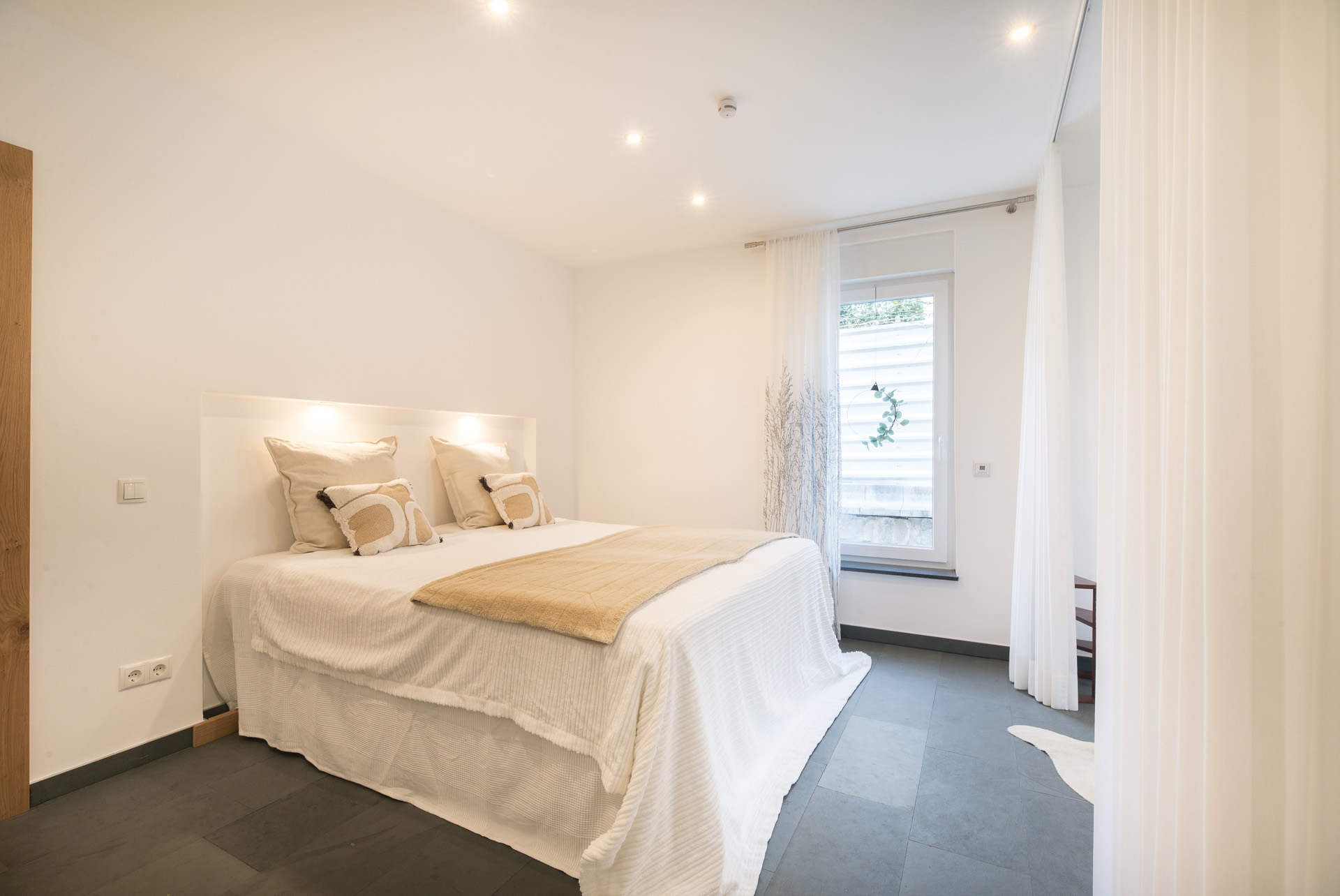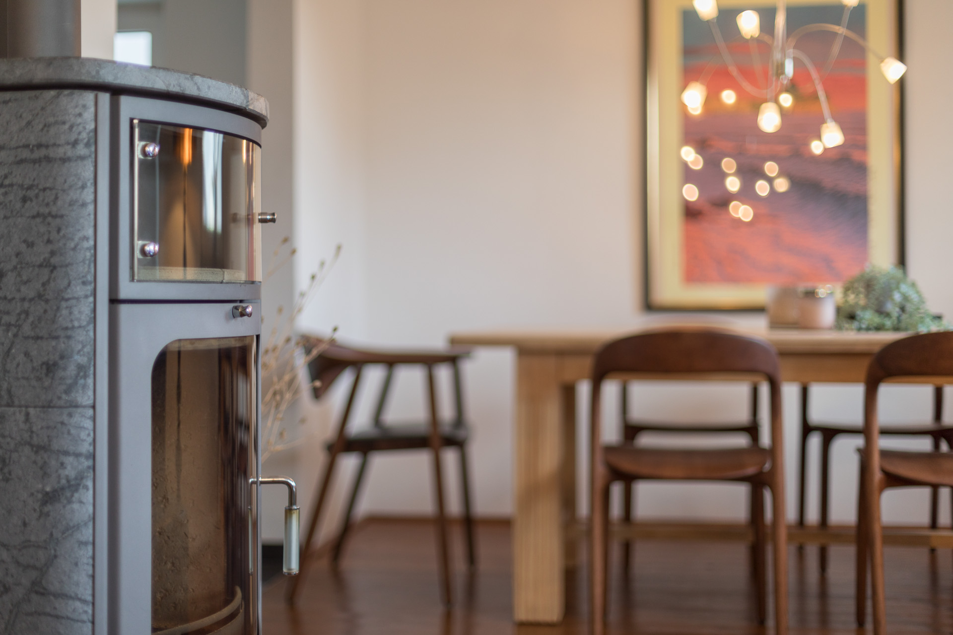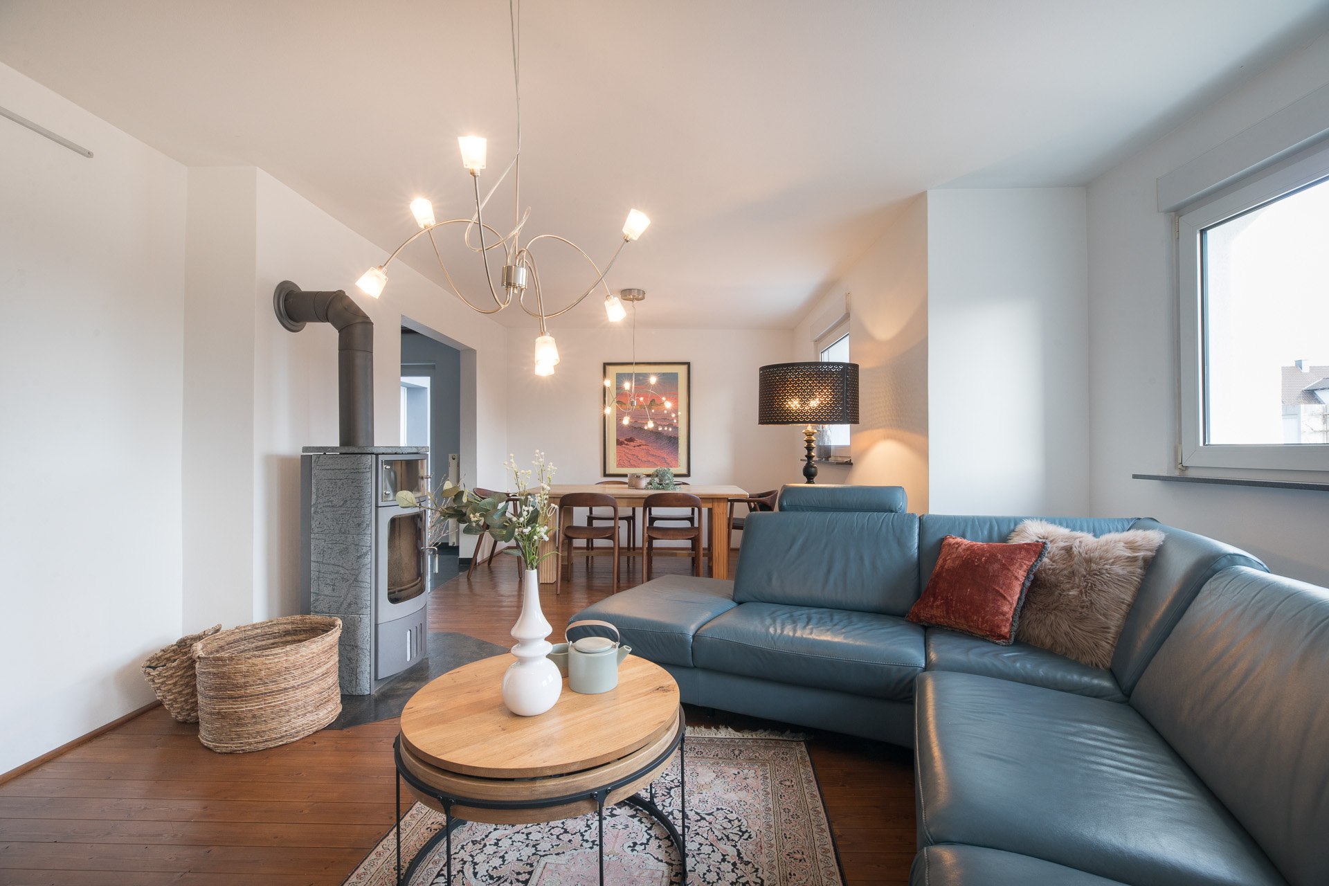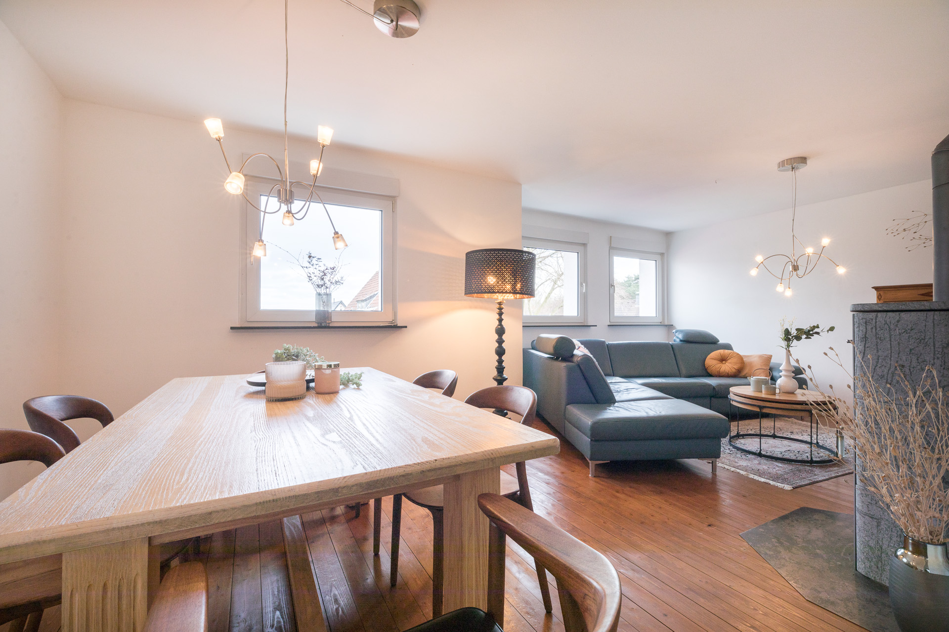 Herzstück des Hauses ist das große, helle Wohnzimmer mit Kaminofen. Die offene Küche ist mit einer modernen, hochwertigen Einbauküche ausgestattet und fügt sich harmonisch in den Wohnbereich ein. Insgesamt stehen vier Schlafzimmer sowie zwei moderne Bäder zur Verfügung – eines mit Dusche, eines mit Badewanne.
