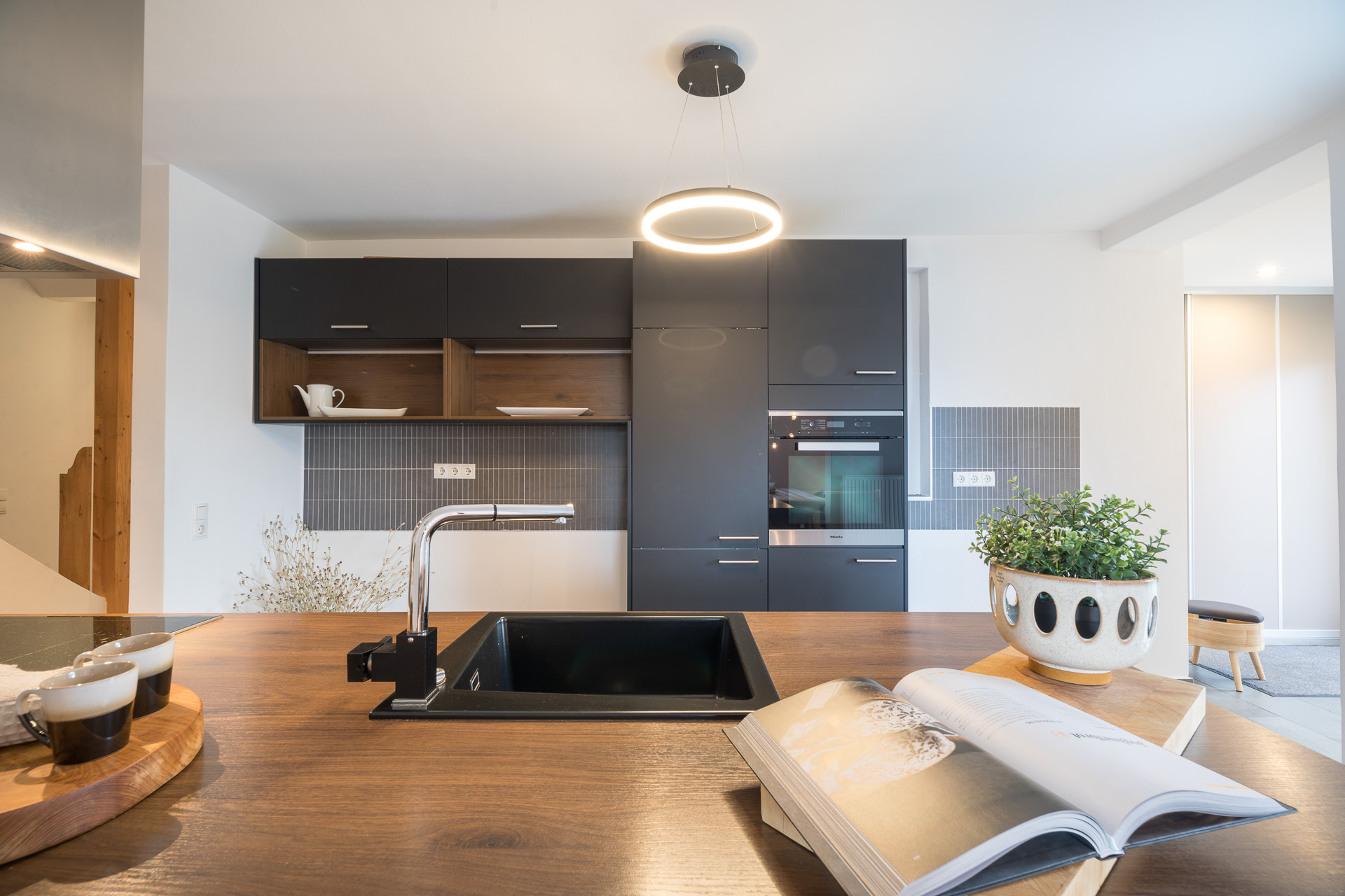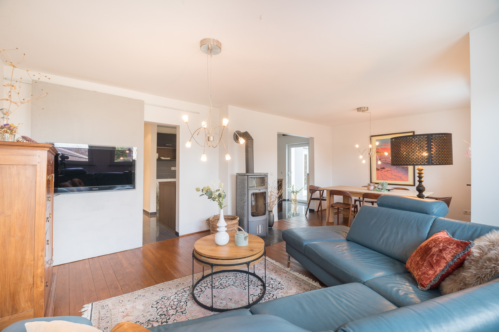 Herzstück des Hauses ist das große, helle Wohnzimmer mit Kaminofen. Die offene Küche ist mit einer modernen, hochwertigen Einbauküche ausgestattet und fügt sich harmonisch in den Wohnbereich ein. Insgesamt stehen vier Schlafzimmer sowie zwei moderne Bäder zur Verfügung – eines mit Dusche, eines mit Badewanne.